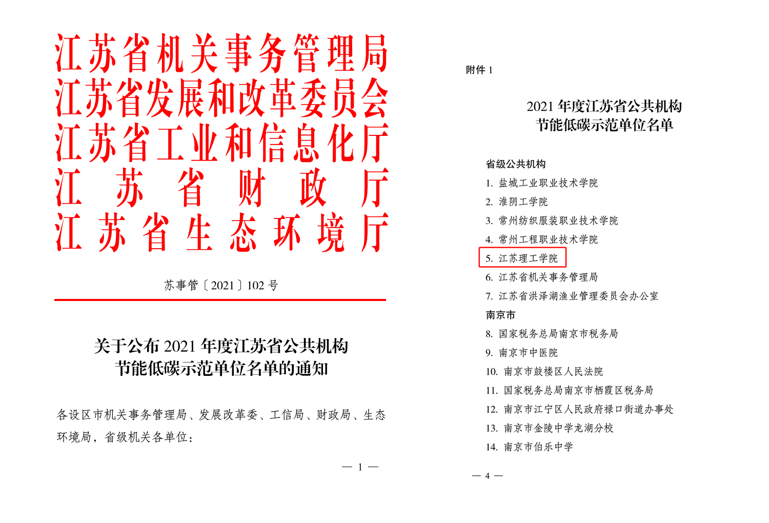 近日,省机关事务管理局、省发改委、省工业和信息化厅、省财政厅、省生态环境厅联合发布《关于公布2021年度江苏省公共机构节能低碳示范单位名单的通知》(苏事管(2021)102号),我校获评“2021年度江省级公共机构节能低碳示范单位”,全省仅有五所高校获此荣誉。