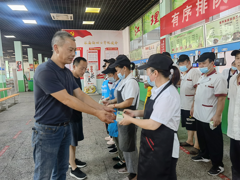 8月14日下午,后勤服务总公司副总经理马祥甸,饮食服务中心经理严继树来到食堂,为坚守在高温炉灶和弥漫蒸汽环境中的食堂一线员工送上一份清凉和贴心关怀。