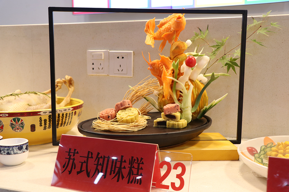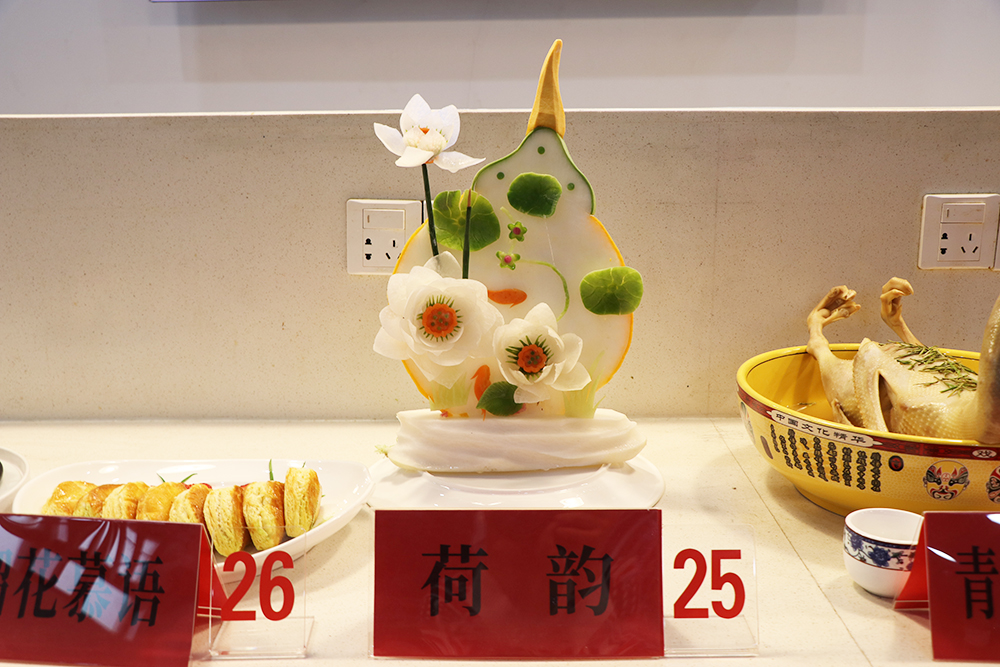 本次比赛分为特色品种、白案、红案三个组别。特色品种、红案会场设在教工餐厅,白案会场设在南苑餐厅。特色品种比赛现场,自营食堂和协作单位各显其能,29项特色创新菜品争奇斗艳、夺人眼球。其中,“孔雀迎宾”冷拼雕刻作品,最为抢眼,虽采用普通食材,但经过精心创作,成为一件精美绝伦、栩栩如生的艺术品;“草船借箭”拼盘让众人惊叹不已,菜盘是一艘木制的小船,“诸葛亮”气定神闲地站立船头,桅杆间用新鲜大虾做的一个个金黄色“稻草人”,再现了三国时期诸葛亮草船借箭的故事。红案比赛品种,为“醋溜土豆丝”、“宫保鸡丁”两道指定热菜。白案比赛品种为“鲜肉大包”,10名点心师、12 名厨师严格按照比赛规程和操作规范,全身心投入,匠心独具,纷纷亮出自己的绝活,展示自己的精湛厨艺。评委从参赛作品的制作工艺、厨艺技能、形态色泽、造型美观等方面进行了认真细致的评选,分别评出三个组别的一、二、三等奖。
