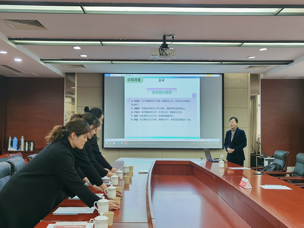 此次培训采取理论学习和实际操作相结合的教学方式进行。在理论讲解方面,龙一平教授主要围绕服务礼仪、会前准备、会中服务、会后清理四大主要内容展开,并详细讲解了仪容仪表、摆台标准、倒茶标准及会议中出现特殊情况时的随机处理方法和注意事项。随后,龙教授对各项技能进行现场演示,并通过一对一、手把手的操作指导,让会务管理员在练习过程中能精准掌握所学内容。