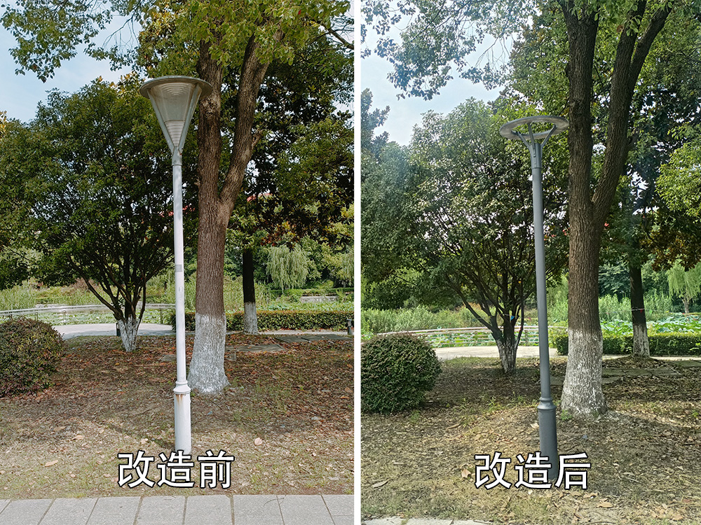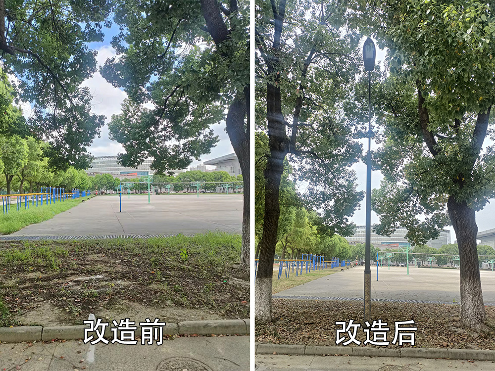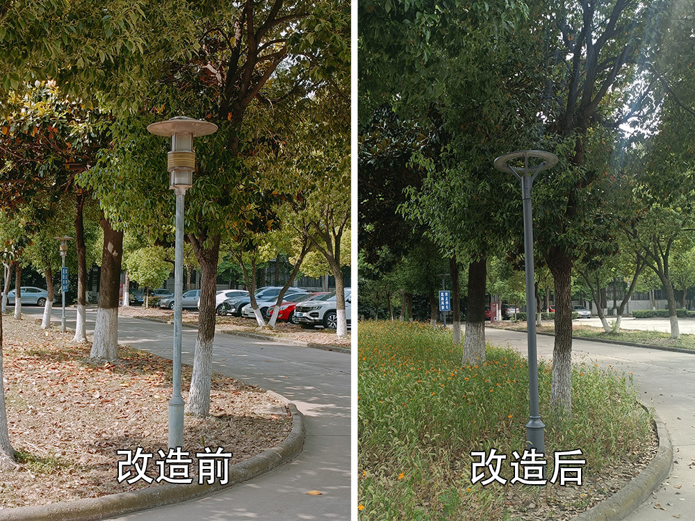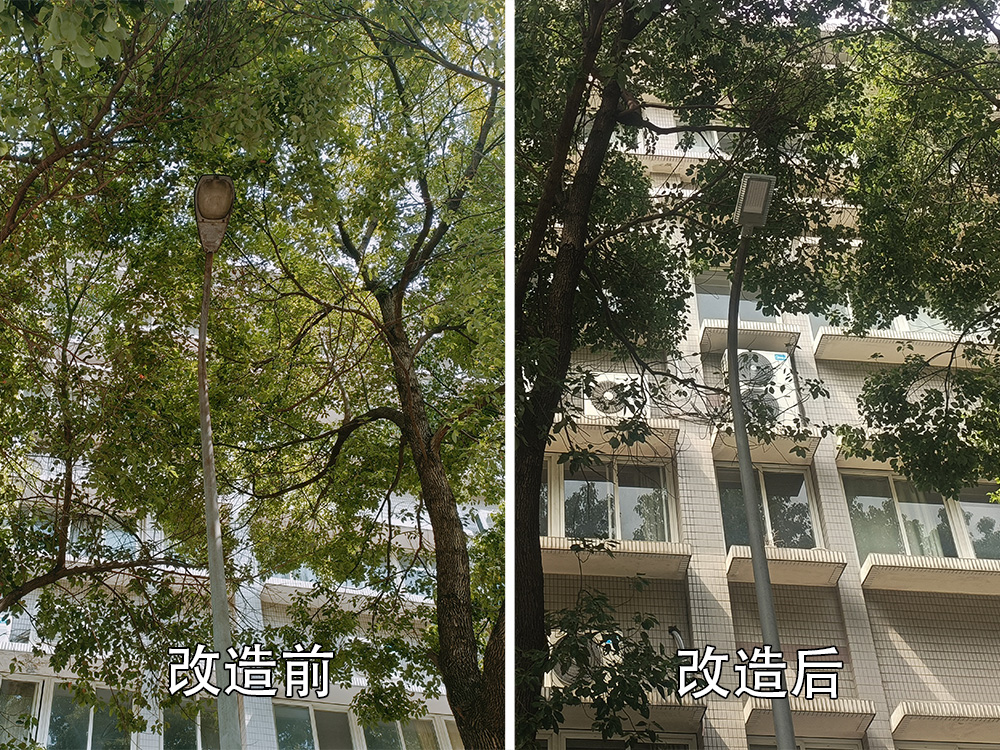 由于学校原有灯具老化、树木遮挡等原因,校园部分区域照明亮度不足。为保证开学后校园照明正常,后勤保障处利用暑期组织路灯检修、亮化工作,并在改造前进行多次实地勘察、灯头样品测试,制定了切实可行的路灯改造方案。此次改造中,更换图书馆、28#楼、30#楼等周边庭院灯灯头79套,更换高杆路灯灯头41套,整体更换校北大门主干道及68#楼篮球场路灯23套,新增北苑食堂广场射灯2盏及67#楼停车场楼顶太阳能射灯6盏。灯光光源均采用LED节能灯具,不仅提升了照明亮度,而且有效节约了能源资源。