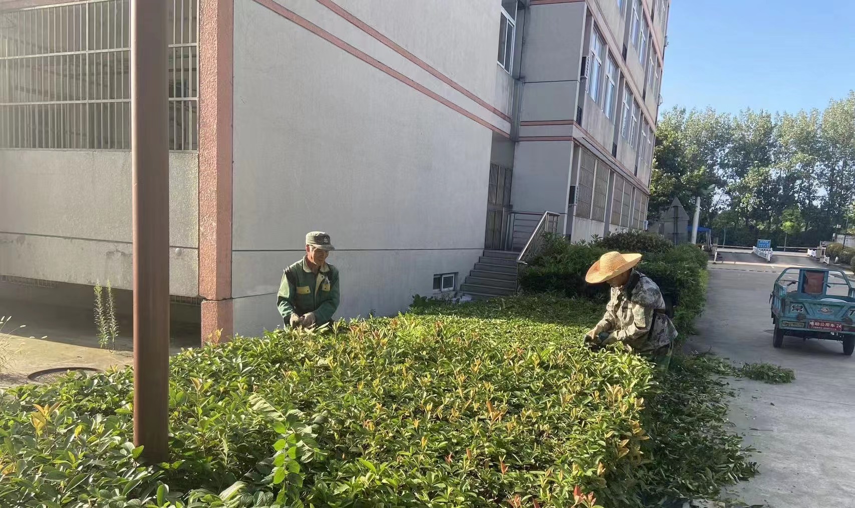 暑期高温多雨,植物和杂草生长较快,绿化队的员工们积极行动,每天顶着酷暑坚守岗位,做好修剪绿篱、清除杂草、清理枯枝,喷药防治等工作,以常态化高标准保持校园的干净整洁。夏季也是防汛重要阶段,如遇雷雨天气,员工们及时疏通落水管,清理下水道,增强应急保障能力,不辞辛苦,任劳任怨,全力保障暑期校园绿化景观效果,为留校师生创造干净舒适的校园环境。