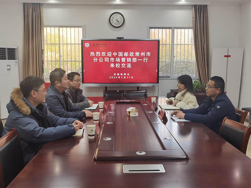 1月11日下午,中国邮政常州市分公司市场营销部副经理朱国栋一行来到我校进行交流,后勤保障处副处长房子磊、综合服务中心经理单春雨参加会议。