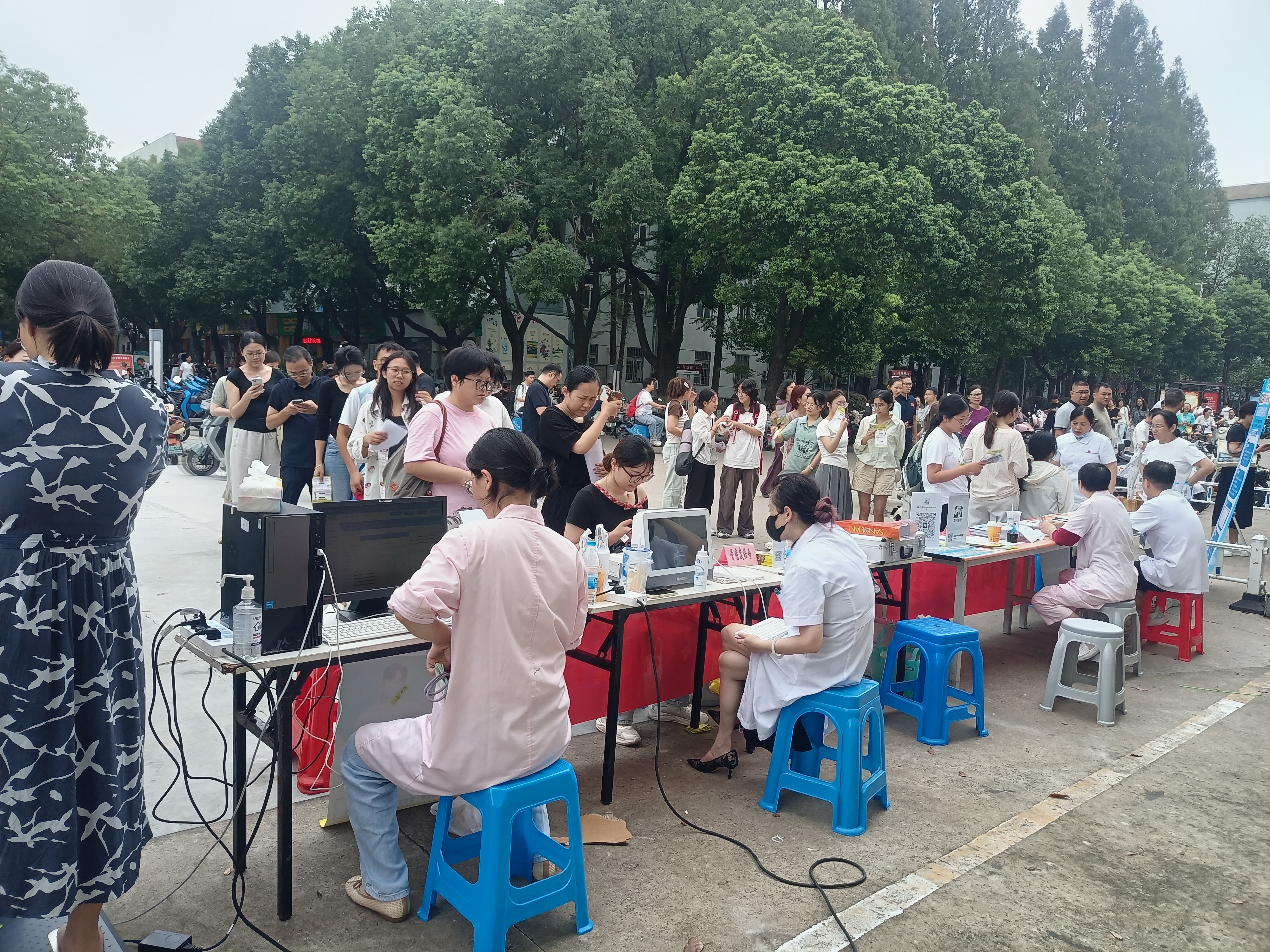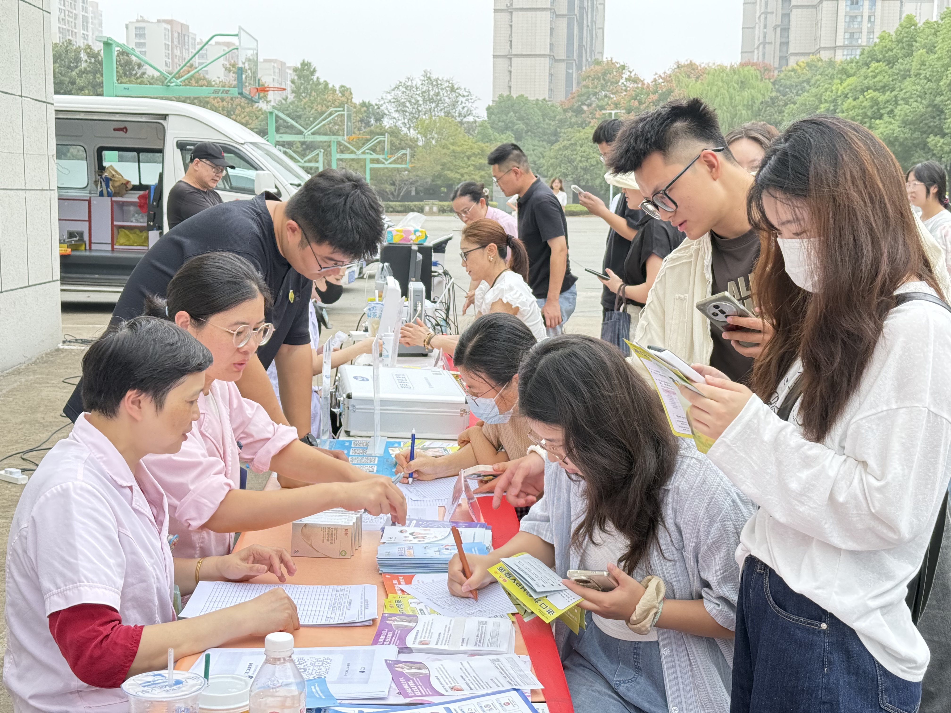 义诊现场,人潮攒动,老师和同学们纷纷前来咨询问诊,医护人员耐心细致地解答了他们的疑问,并为学校师生们提供了免费的疫苗咨询、体脂检测、骨密度检测、中医耳穴艾灸刮痧等特色服务。在义诊过程中,医护人员认真地为每一位同学进行检查,询问同学们的日常身体状况、饮食习惯、睡眠情况等,为大家提供个性化的健康建议。