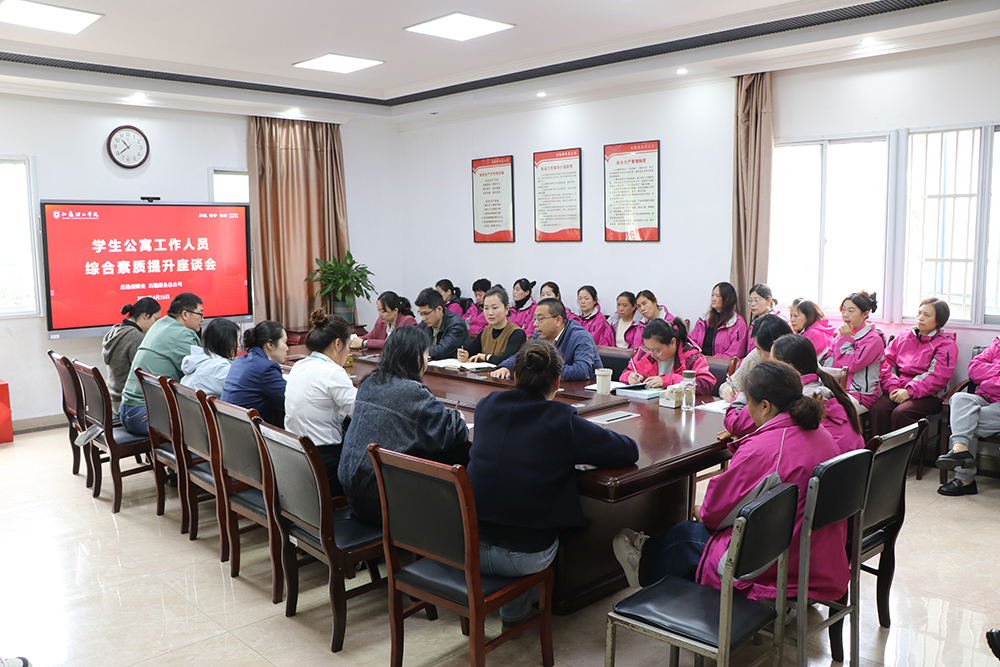 为进一步强化学生公寓管理人员服务能力,提升服务质量与管理水平,4月15日上午,公寓服务中心召开学生公寓工作人员综合素质提升座谈会。公司副总经理房子磊、质培科以及公寓中心全体工作人员参加会议,质培科科长丁静主持会议。